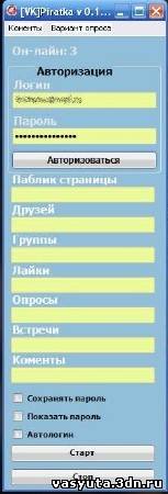 [VK]Piratka - программа для накрутки Вконтакте. Через ее Вы сможете накрутить *Друзей *Подписчиков *Сердца "Мне нравится" *Участников в группы *Участников на встречи *Участников в паблик *Опросы *Накрутка комментариев Краткое FAQ: 1. Авторизация Вводим свои логин и пароль с Vkontakte в соответствующие ячейки! Авторизация только подтвержденных номером телефона акков. Если авторизация успешна выбьет сообщение. Если же выбивает ошибку, проверьте правильность ввода данных, если же все правильно и акк подтвержден - отключите антивирус 2. Добавление заданий Параллельно в программе можно крутить на все направления. Вставлять только цыфровой ID Выбираем что нам нужно крутить! Вставляем ссылк