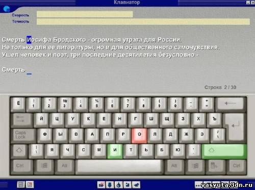 Этот диск поможет Вам научиться быстро и без ошибок набирать тексты на клавиатуре Вашего компа. Клавиатор состоит из 40 основных упражнений для тренировки базисной техники, 2 упражнений со словами и предложениями и 16 текстов. Редактор упражнений, входящий в состав программки дозволит Вам делать, а затем и выполнять свои упражнения. Клавиатор запоминает главные итоги каждого выполненного до конца упражнения. Предусмотрен ряд игр с мышью и клавиатурой. Информация о программе: Название: Клавиатор Жанр: обучающая, мультимедийный диск Снято: Media Art Язык: русский Формат: EXE (autorun) ОС: Windows 95/98/NT/2000/ME/XP/Vista/Sev
