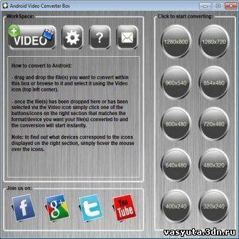 Android Video Converter Box - программа, позволяющая конвертировать видео специально для мобильных устройств под управлением ОС Android. В настройках программы можно выбирать желаемый формат видео, а так же подстраивать разрешение под различные дисплеи. Если Вы пользователь Android, и хотите насладиться видео на его устройстве не теряя времени на изучение форматов и типов файлов для конвертирования на данный гаджет, значит Вам пригодится Android Video Converter Box. Android Video Converter Box это то, что вам нужно. Он был разработан, для того, что бы упростить для процесс конвертирования самым простым способом, не требуя никаких технологий навыка с вашей стороны. Android Video Converter Box предлагает максимум удобство и скорость, для того, что бы сэкономить время и нервы.