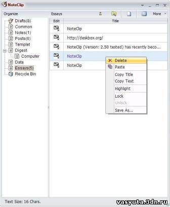 Базовые особенности приложения: - Полная поддержка операций перетаскивания - Не ограничено число заметок , а также уровень их группировки. - Выполнение мониторинга буфера обмена или захват текста путем использования горячих клавиш - Имеется возможность моментально совершать вставку текста в целевое приложение. - Защита заметок путем использования пароля - Импорт , да и экспорт заметок в текстовые файлы - Удачный интерфейс, поддержка различных красивых скинов.