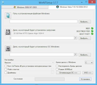 Описание: WinNTSetup представляет собой утилиту, которая дает возможность создать дополнительный загрузочный модуль для операционной системы. Речь идёт о том, что установочный диск легко сделать на обычной внешней флэшке. Программа создает специальный дистрибутив, посредством которого в дальнейшем можно провести полноценную инсталляцию Windows на ноутбук или домашний компьютер.